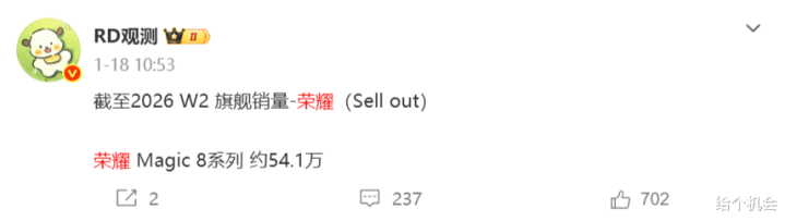 荣耀magic 8系列的两款手机销量不太好,据RD观测统计的数据显示,截至2026年W2周销量大约是54.1万,在国产旗舰中销量是垫底的。