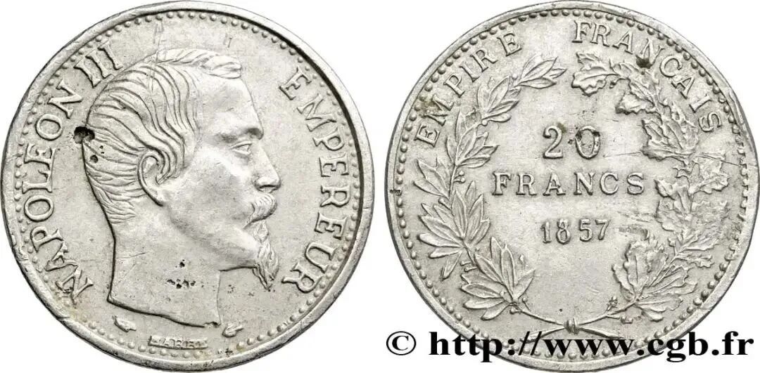 1857年拿破仑三世铝制20法郎,含铝量 3.3 克,同期代20法郎金币含金量为5.8克(cgbfr)
