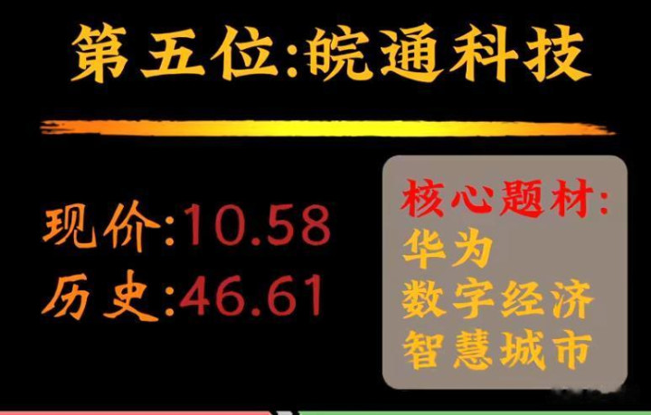 皖通科技现价10.58,历史高价46.61,涉及华为、数字经济和智慧城市。华为概念自带热度,数字经济和智慧城市也是政策支持的方向。但大家要理性看待这类题材,重点关注公司与华为的合作深度以及在数字经济、智慧城市项目中的实际营收占比。
