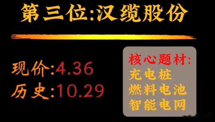 汉缆股份现价4.36,历史高价10.29,聚焦充电桩、燃料电池和智能电网。充电桩和智能电网受益于新能源汽车和新电力系统的发展,燃料电池则是氢能产业链的关键环节。但要注意,能源基建领域竞争也比较激烈,需要关注公司在这些细分领域的市场份额和技术优势。