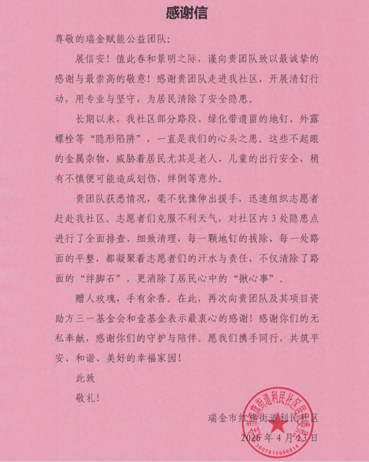 “感谢你们的忘我奉献,感谢你们的看守与奉陪……”近日,瑞金市红旗街谈利民社区向瑞金赋能公益发来感谢信,感谢瑞金赋能公益走进利民社区,开展清钉行为,用专科与遵从,为社区拔除了安全隐患。